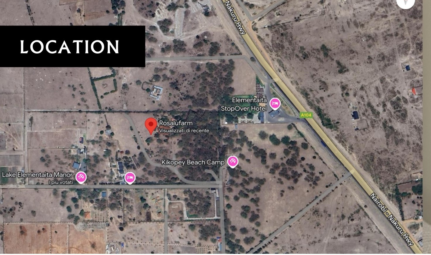 The estate is located very close to a number of lodges that overlook Lake Elementaita and the Soysambu Conservancy. The most prominent nearby lodge is Lemon Valley Farm Estate and others include the following: